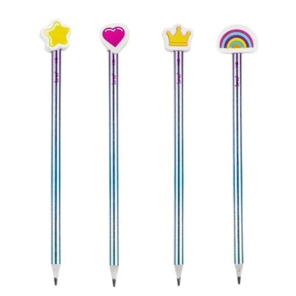 Detalhes: Lápis HB Beloved / Feito de resina / Possui formato redondo / Corpo decorado / Vem com borracha no topo / Temas: Coração, Estrela, Coroa e Arco-íris / Produto Certificado INMETRO (Artigo Escolar/Segurança) – Registro 003089/2018.