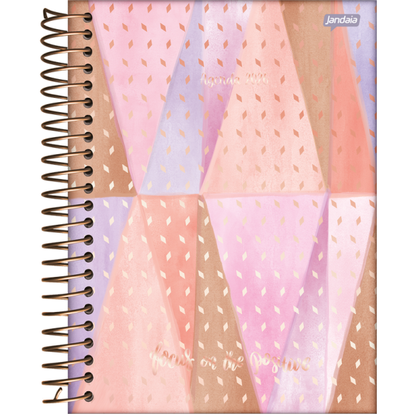 Detalhes: Capa dura / Capa com detalhe metalizado / Espiral colorido / Parte interna da capa decorada / Bolsa de papel decorada / Folha de adesivos / Planejamento mensal / Planejamento anual / Visão diária, exceto sábado e domingo / Folhas pautadas decoradas / Folhas em cor creme / Formato: 133mm x 178mm / Gramatura: 70g/m² / 352 Páginas.