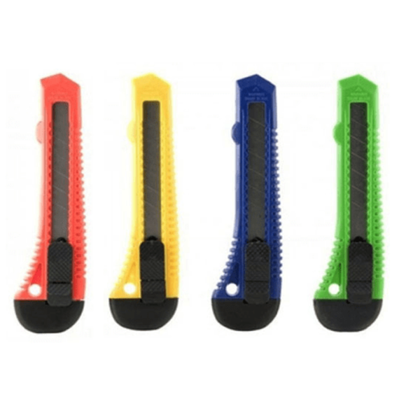 Comprimento: 150mm / Lâmina: 18mm / Com trava de segurança Cores sortidas sendo: Azul, Verde, Laranja e Amarelo