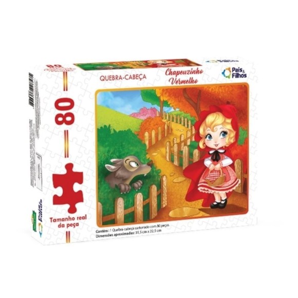 Detalhes: Quebra-Cabeça Chapeuzinho Vermelho / Embalagem contém: 1 Quebra-Cabeça cartonado com 80 peças / Dimensões aproximadas: 24cm x 39cm / Idade: + 4 anos / Produto Certificado INMETRO – Registro 003755/2019.