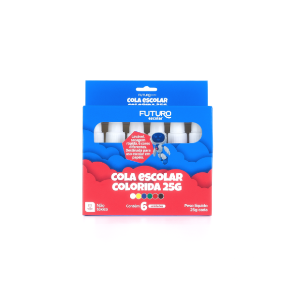 Detalhes: Cola colorida Futuro / Lavável / Secagem rápida / Ideal para uso escolar em papel / Embalagem com 6 cores diferentes (branco, amarelo, azul, verde, vermelho e preto) / Produto Certificado INMETRO (Artigo Escolar/Segurança) – Registro 007011/2022