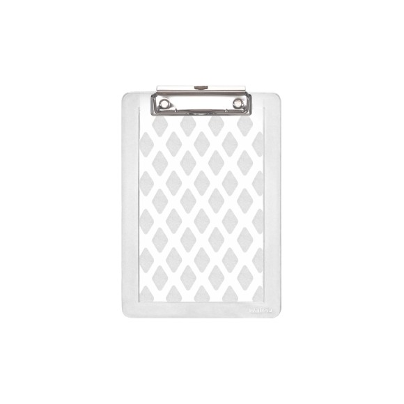 Prancheta ½ ofício fabricada em poliestireno / Prendedor feito em metal com formato retangular e com alça, possibilitando a fixação da prancheta na parede / Possui cantos arredondados / Cor: Cristal / Medidas: 0,3 x 16 x 24,2.
