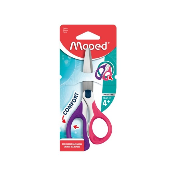 Especificação: Práticas e confortáveis, as tesouras assimétricas Comfort são duráveis e durarão ao longo do tempo. Graças aos seus anéis assimétricos e ergonômicos, estas tesouras Comfort proporcionam uma aderência natural e confortável. Suas lâminas em aço inoxidável oferecem alta qualidade de corte. Tesouras de 13 cm, adequadas para crianças. Desfrute de uma tesoura confiável e segura que pode ser segurada sem machucar. A flexibilidade dessas tesouras previne a tensão e garante que as crianças tenham controle ótimo ao usar seu par de tesouras.