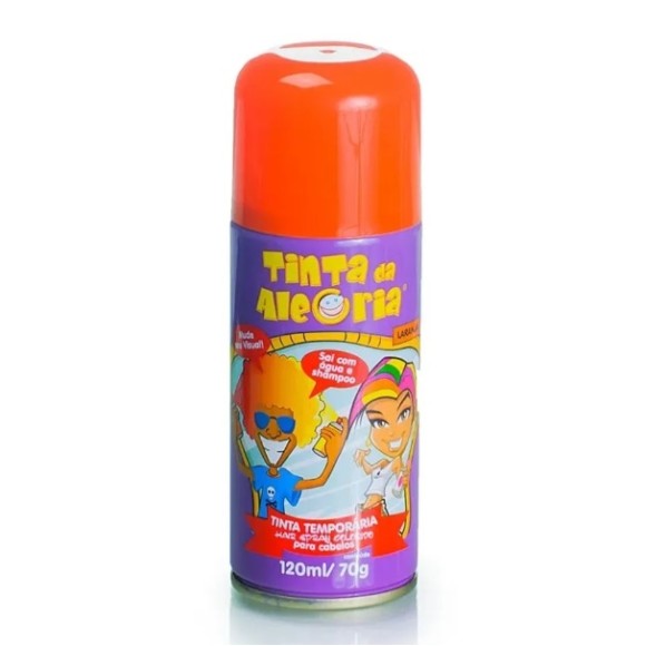Spray para Cabelos Tinta da Alegria 120ml Laranja A Tinta Spray para Cabelos Alegria é uma tinta colorida temporária feita com pigmentos cosméticos, ideal para ser usada em festas temáticas, eventos, torcida, etc.