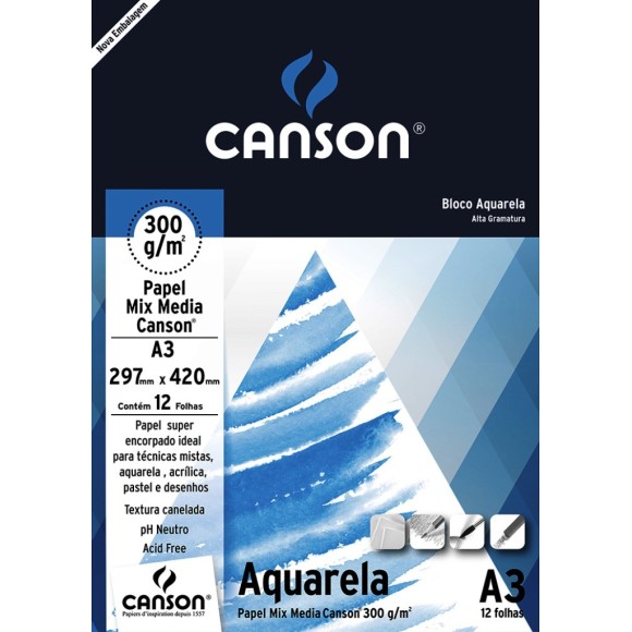 Técnicas recomendadas: Especialmente indicado para aquarela, tinta acrílica e também para técnicas secas, como giz pastel, giz oleoso e lápis de cor. / Formato: A3 / Medidas: 297 x 420mm / Gramatura: 300g/m²