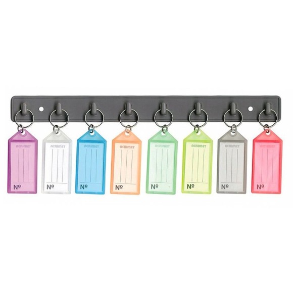 Suporte autoadesivo na cor grafite / Acompanha 8 chaveiros em cores sortidas / Possui orifícios que também possibilitam fixação por meio de parafusos / cada chaveiro possui uma etiqueta interna para identificação da chave