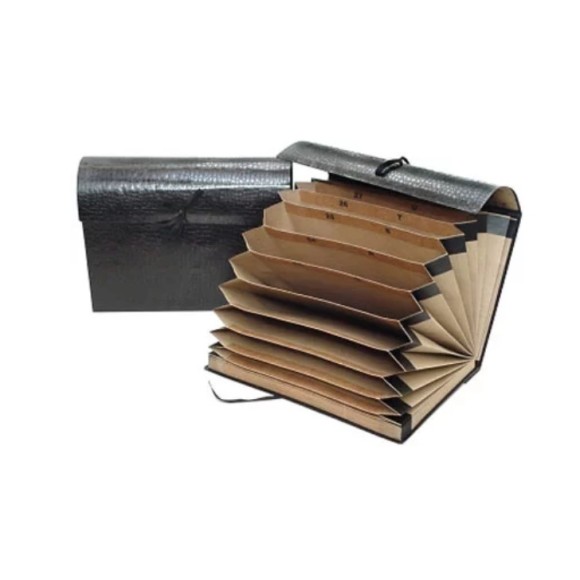Pasta sanfonada duplicata feita em cartão kraft / Contém 31 divisórias em ordem alfabética e numérica / Formato: 250mm x 185mm