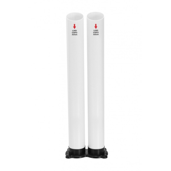 Possui dois tubos para descarte de copos de 180/200mL (água), os tubos são extrusados em plástico poliestireno (PSAI) e a base é injetada em plástico polipropileno (PP) / Acompanha adesivos correspondente / Capacidade: 300 copos de água (aproximadamente) / Tubo de água: 85mm (diâmetro) / Medida: 740mm (altura) x 233mm (largura) x 132mm (profundidade).