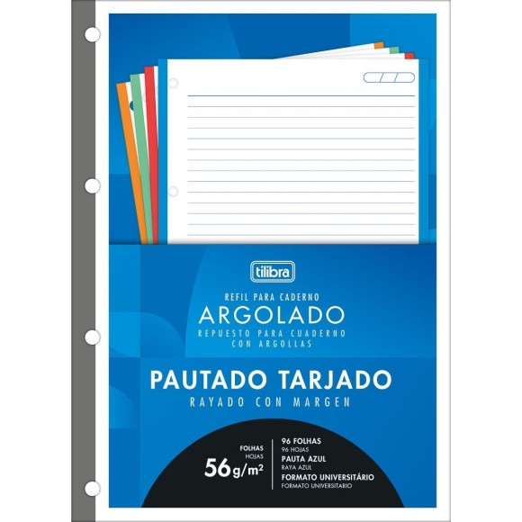 O refil Tiliflex para caderno argolado universitário tarjado 96 folhas possui folhas pautadas coladas. As tarjas coloridas das folhas pautadas auxiliam na organização e separação das matérias. Ideal para o dia a dia na escola ou na faculdade.
